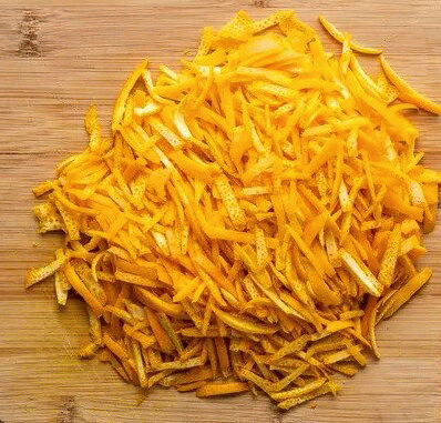 Use a potato peeler to peel the oranges (figure 1) and then thin slice approximately half of the peels (figure 2). Discard the rest of the peel. With a sharp knife remove as much of the remaining pith on the oranges as reasonable. Discard the removed pith. Again, with a sharp knife, chop or slice the naked oranges. We want to keep as much of the juice as possible.